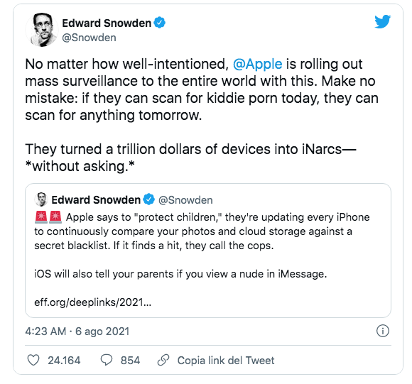 L’Ex tecnico della Cia, Edward Snowden, che nel 2013 rese pubbliche le informazioni relative ai sistemi di sorveglianza mondiale, ha duramente criticato la scelta di scansionamento delle immagini dei dispostivi Apple. Ha detto: