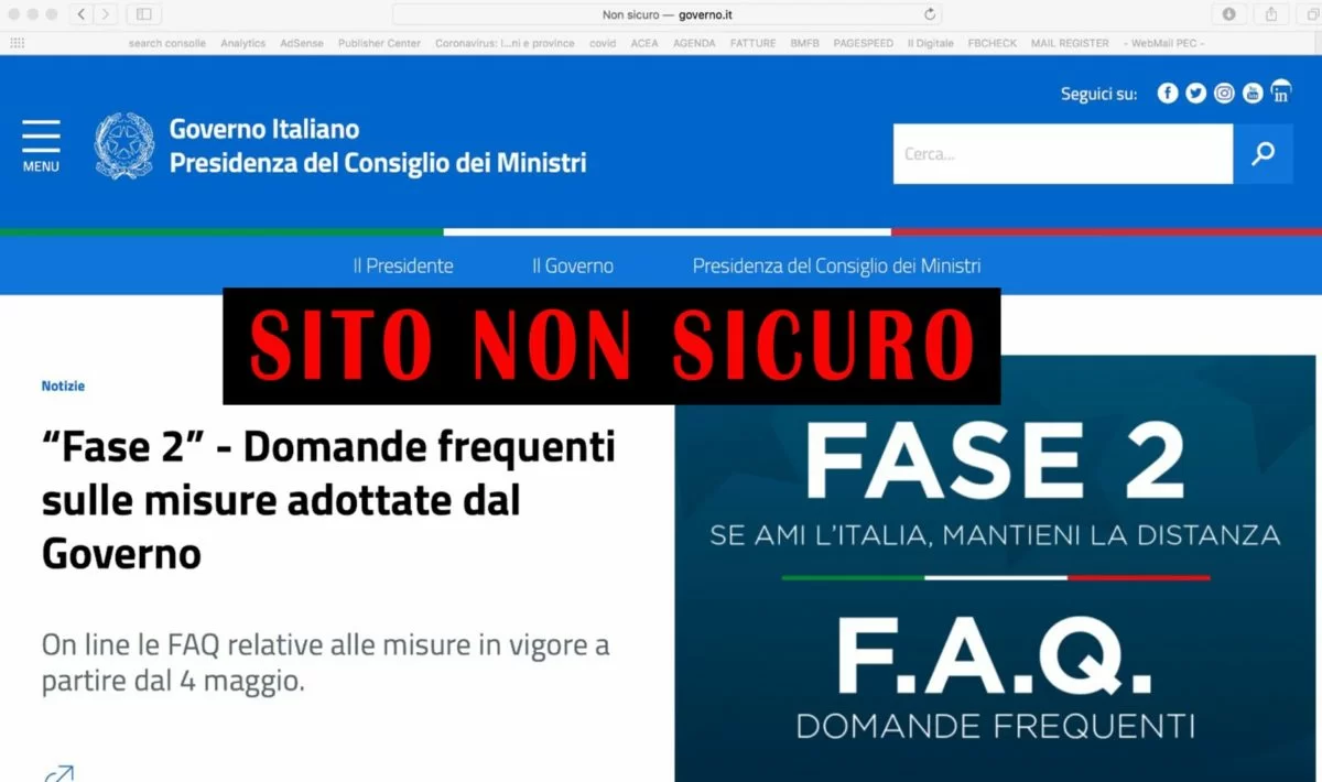 Quando ci viene segnalato dal browser che il sito non è sicuro spesso accade perché su quel sito è presente un contenuto misto, nel caso specifico del sito del Governo i parametri SSL potrebbero risultare non sicuri per questa ragione. In questo caso il certificato SSL potrebbe non essere indispensabile ma sarebbe meglio averlo, anche solo per un fatto di immagine e autorevolezza. Fra moduli per le autocertificazioni cartacee, sito inps in tilt e un sito ufficiale di Palazzo Chigi senza certificato SSL l’talia dimostra di essere ancora una volta indietro rispetto agli standard digitali europei e mondiali. Leggi anche: Coronavirus, pesce d’aprile per il bonus di 600 euro su sito INPS