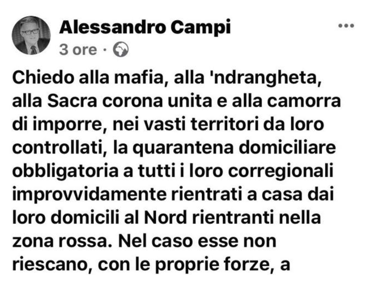Chiedo alla mafia, alla ‘ndrangheta, alla sacra corona unita e alla camorra, nei vasti territori da loro controllati, di imporre quarantena domiciliare obbligatoria a tutti i loro corregionali improvvisamente rientrati a casa dai loro domicili al Nord nella zona rossa. Nel caso esse non riescano, con le proprie forze, a garantire il rispetto di questa elementare norma di prudenza, riterrei ragionevole da parte loro chiedere la collaborazione delle autorità pubbliche dello Stato italiano. In questo momento tutte le istituzioni debbano collaborare.