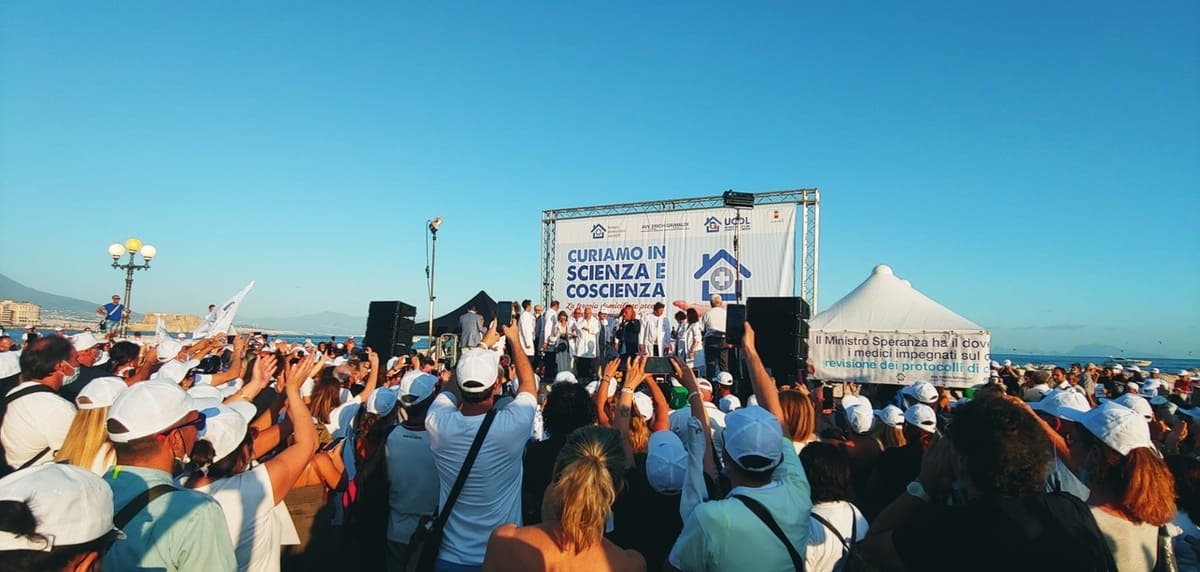 Centinaia di medici e pazienti guariti della rete e del Comitato Terapia Domiciliare Precoce in piazza anche a Napoli ieri, sabato 10 luglio, hanno gridato a gran voce che le cure funzioo, che il Covid si può curare a casa. Dopo le Conferenze a Piazza del Popolo a Roma e Piazza del Duomo a Milano, questo è stato il terzo appuntamento per chiedere alle istituzioni la revisione dei protocolli di cura domiciliare sulla base delle evidenze raccolte sul campo dai medici della rete Terapie Domiciliari Covid-19.